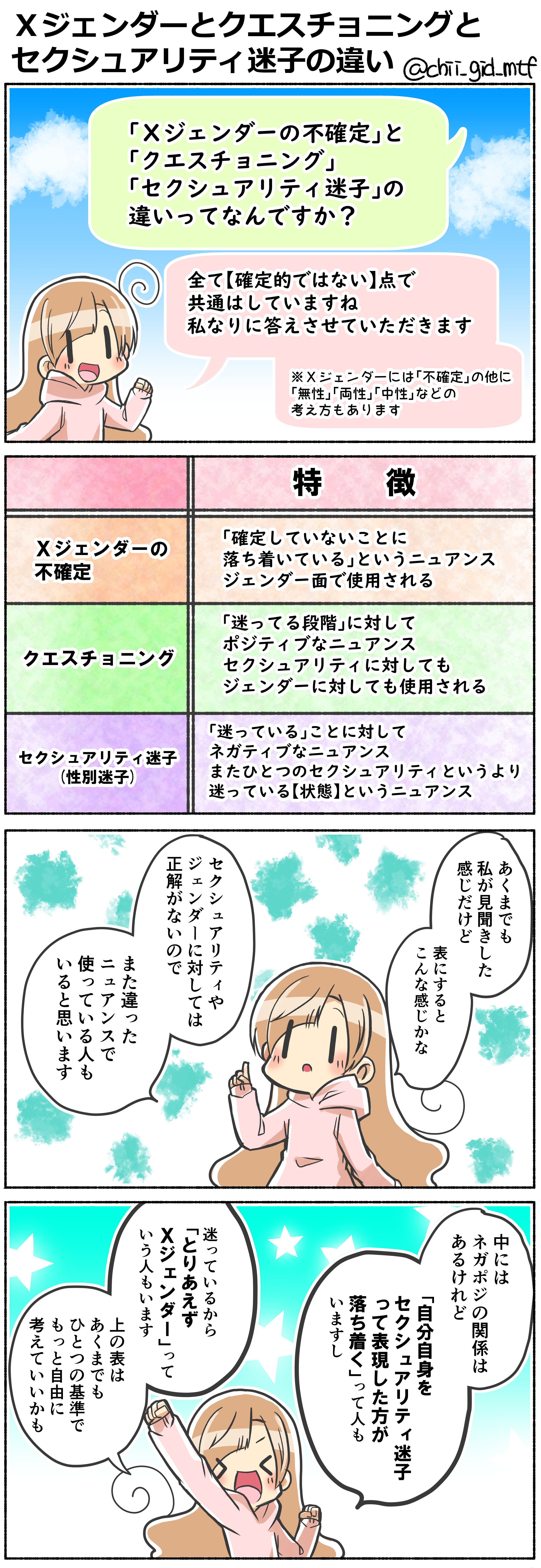 次にクエスチョニングはよく「迷っている段階のセクシュアリティ」と表現されていますね。特徴的なのはポジティブなニュアンスかなと。Xジェンダーの不確定とは違って、性的指向にもジェンダー(性自認)にも使われますね。