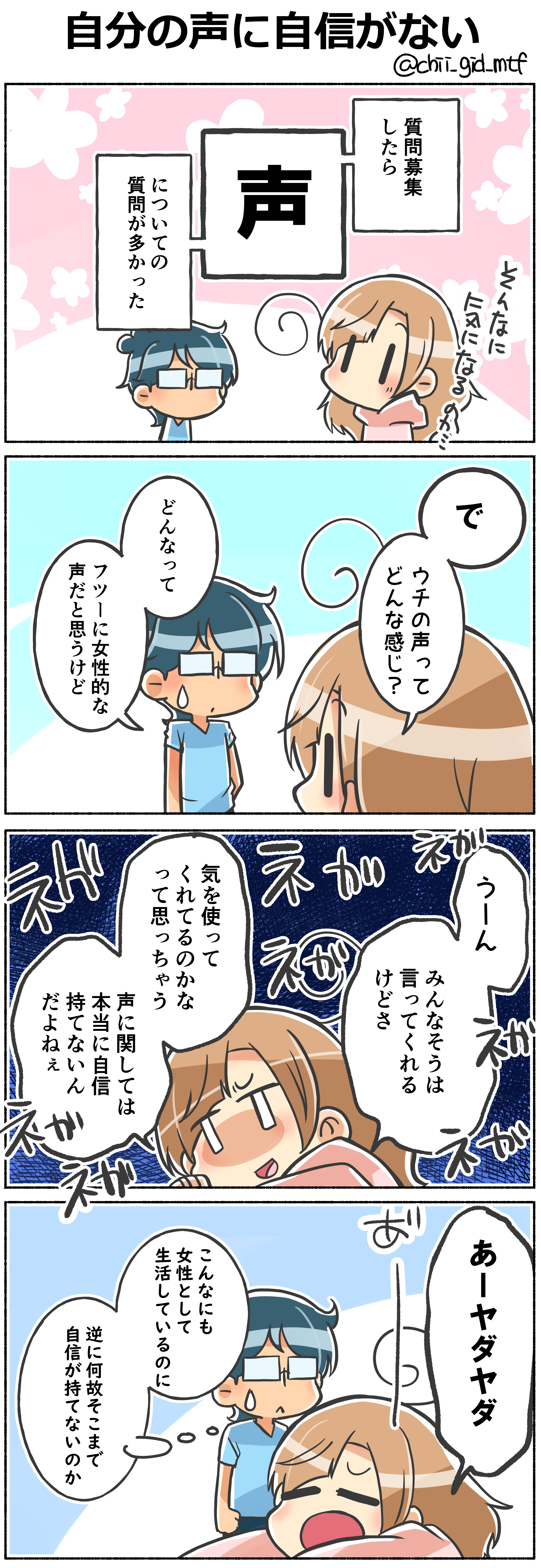でも、日常生活で気にすることはほとんどないです。自分の性別のことを公にせずに生活してる時点で気にする余裕はないんですけどね。夫くんや母親からは「何故自信が持てないのか」とよく言われますが、自信が持てないものは持てないんですw