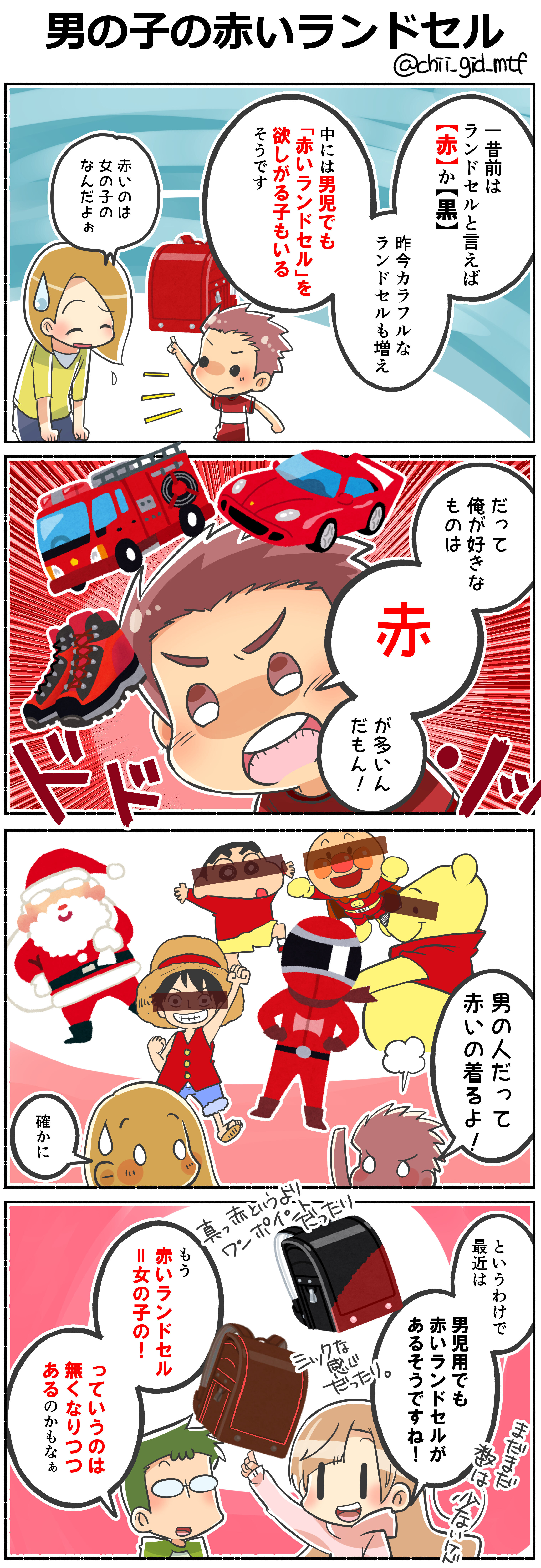 どこのこだかは忘れましたが、赤いランドセルを持っていた男の子がバカにされていたら「赤は正義の色なんだよ!」と言ったそうです