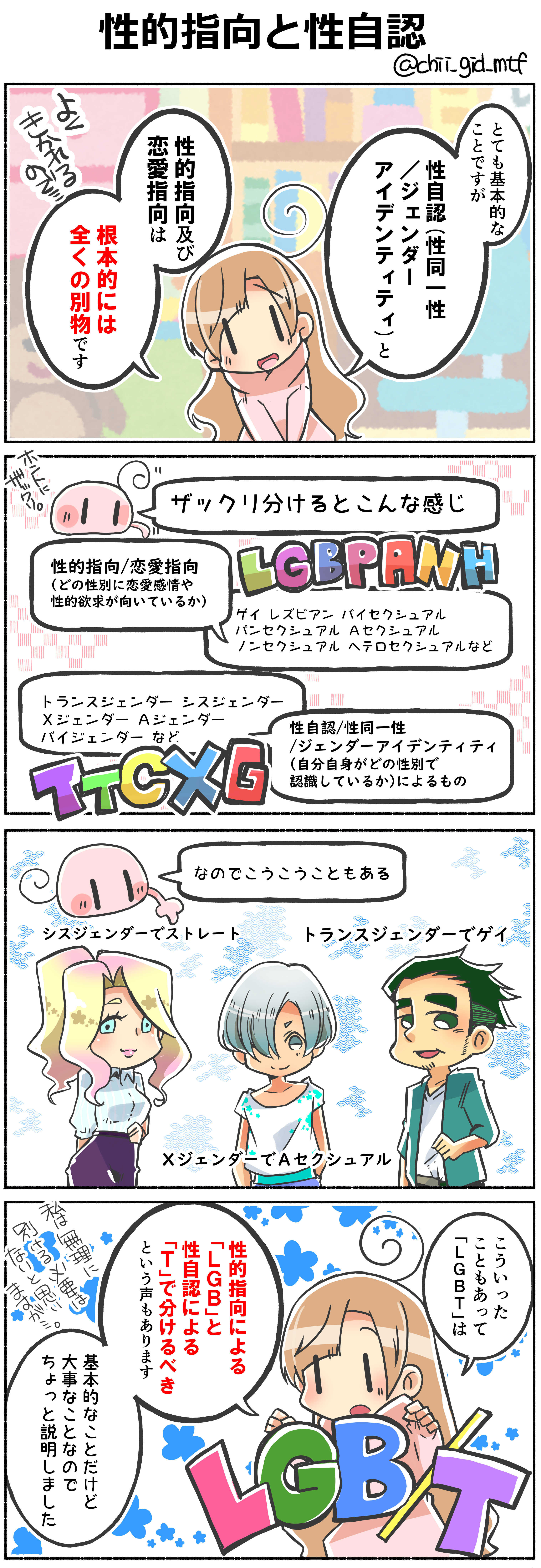 なので「LGBT」を性的指向に関する「LGB」と性自認や性別移行に関する「T」と分けるという考え方もある。私としては状況と場合によって分けたり一緒にしたりすればいいので、無理に分ける必要はない派なのです。