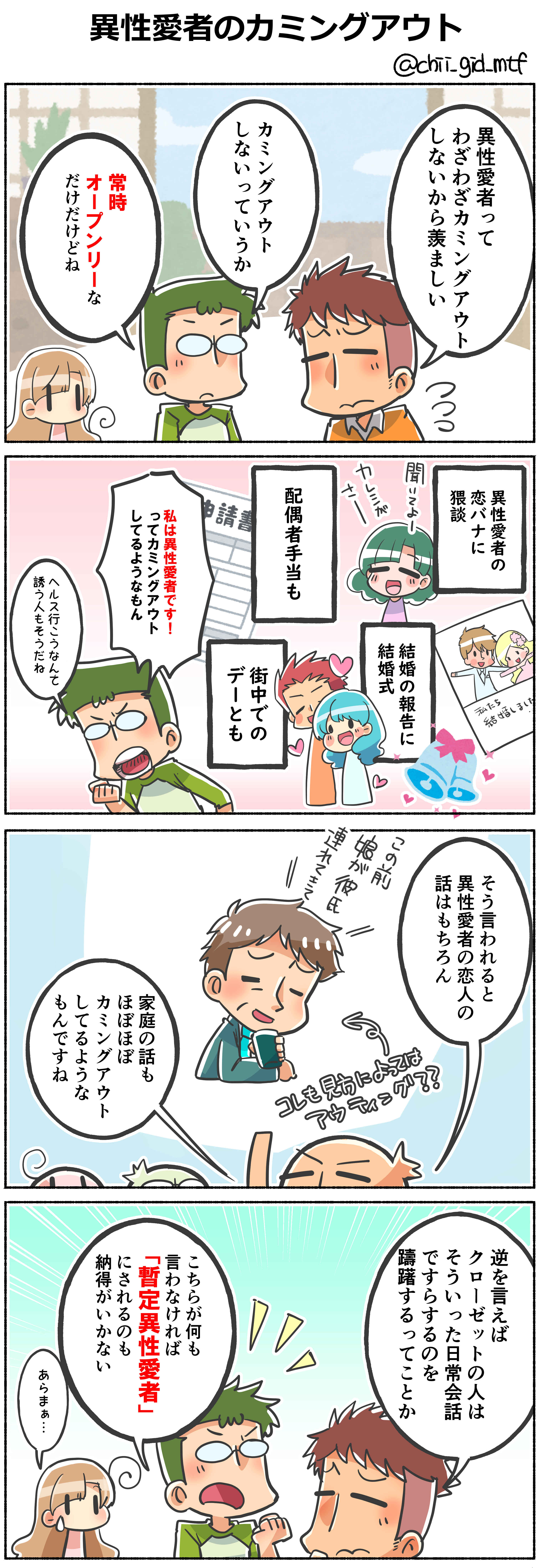 極端なお話な気がしないでもないですが、あながちズレてるとも言い難い……。確かに異性愛は自分からカミングアウト…というより常時オープンって感じはしますね…。反面非異性愛は何も言わなければ暫定異性愛者ってのもあるあるな気がします……。あれやこれや考えだすときりがないですね。
