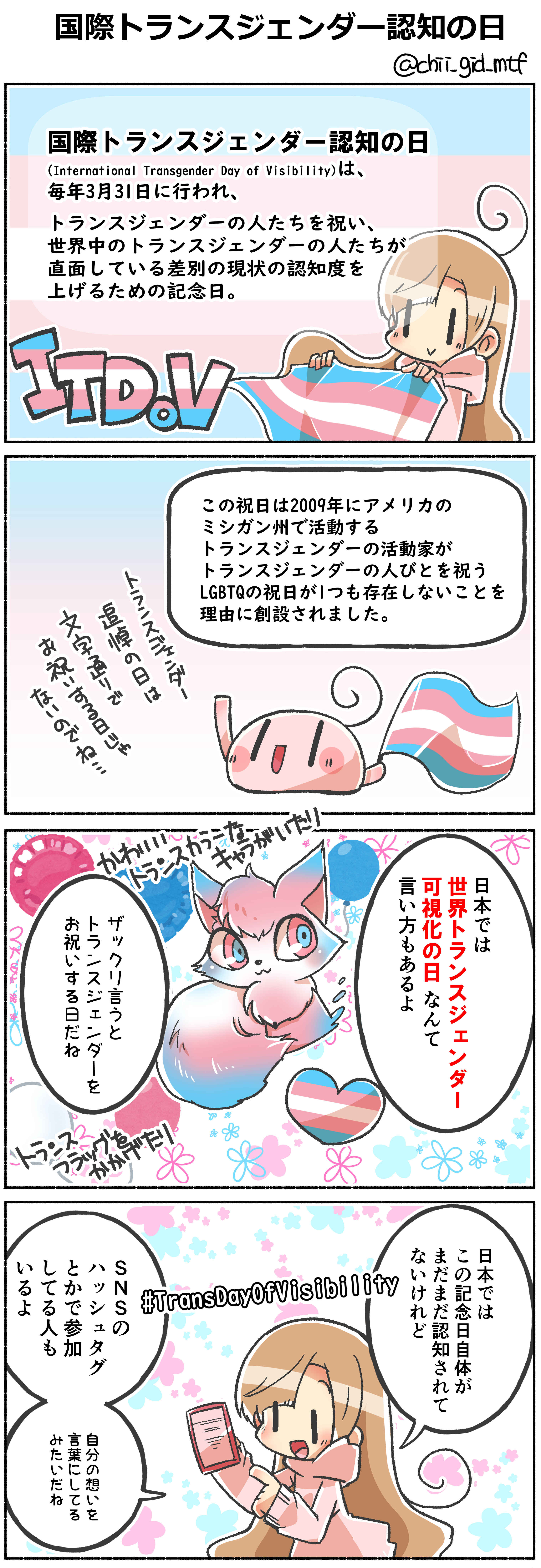 大々的に何かするというより、透明人間になりがちなLGBTQ…その中でトランスジェンダーについて認知してもらうために意思表示をしよう!トランスジェンダーであることを引け目に感じないで!っていうニュアンスが近いもしれないです。