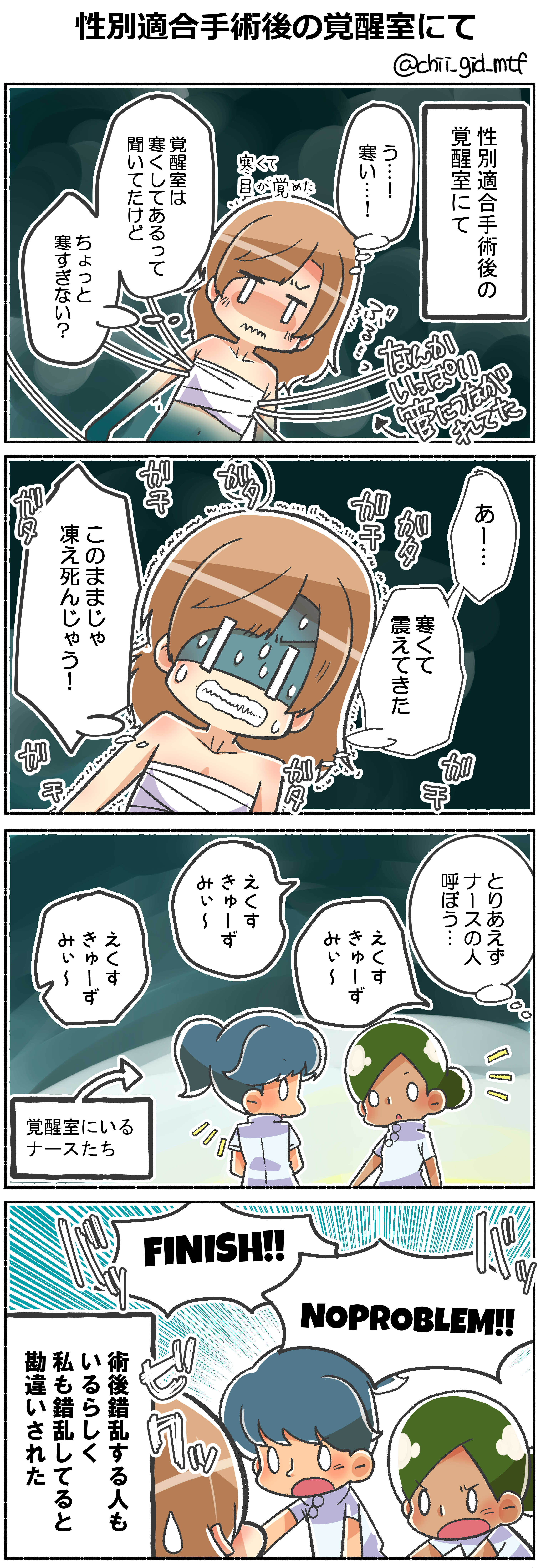 タイへ性別適合手術をしに行ったときの話です。手術のあと、覚醒室というところで寝かされるのですが、まー、寒い。痛いとか、そんなことよりも寒い。覚醒室は、あえて温度を下げていると聞いたことがあったのですが、あまりの寒さに、ガチで「ヤバい!凍え死ぬ!」って思ったくらい。