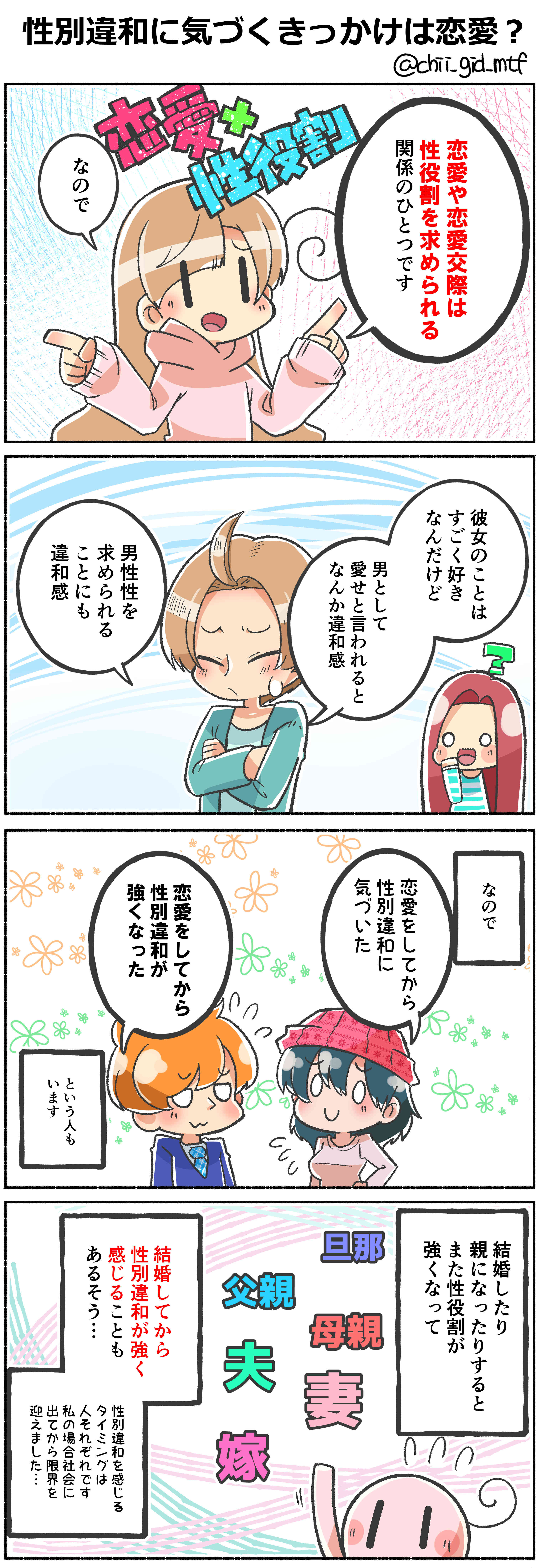 多かれ少なかれ「性別違和に気づくきっかけが恋愛」ってことはあると思います。それは恋愛や恋愛交際が「性役割」に密接にかかわってるからかなと思っています。