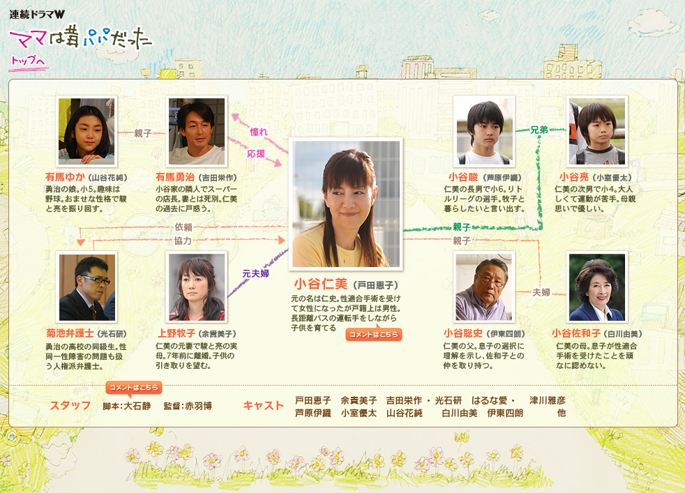 『ママは昔パパだった』は、2009年に全6話で放送された連続テレビドラマで、2008年6月に実際行われた性同一性障害特例法改正をモチーフに、性同一性障害を抱える主人公が、様々な困難に直面しながらも、母親として、女性として、ひとりの人間として、明るく前向きに生きていく様や、主人公を支える家族や友人との絆を、オリジナルストーリーとして描き出す。
