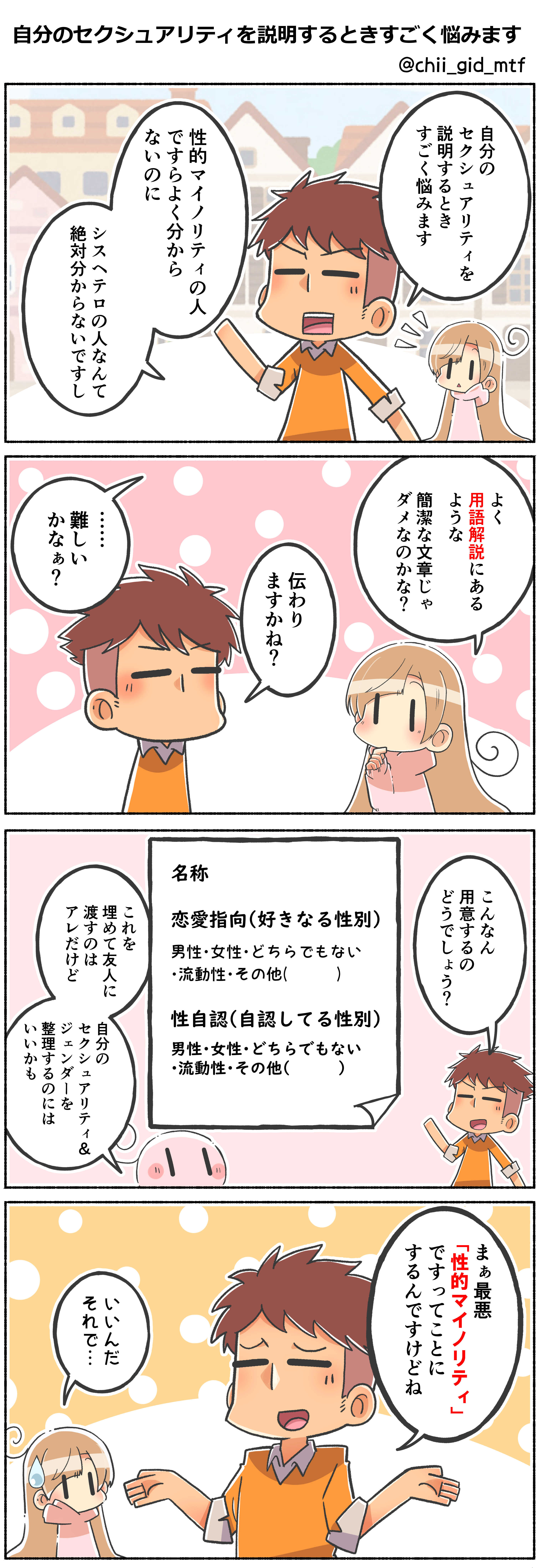 説明しても結局理解してもらえないってことも多々あるらしく「(LGBT以外の)性的マイノリティです」とひとくくりにすることもあるそうです。そうなってしまうと、いよいよ理解から遠のきそうだけど、変に誤解されれるよりはいいのか……な?