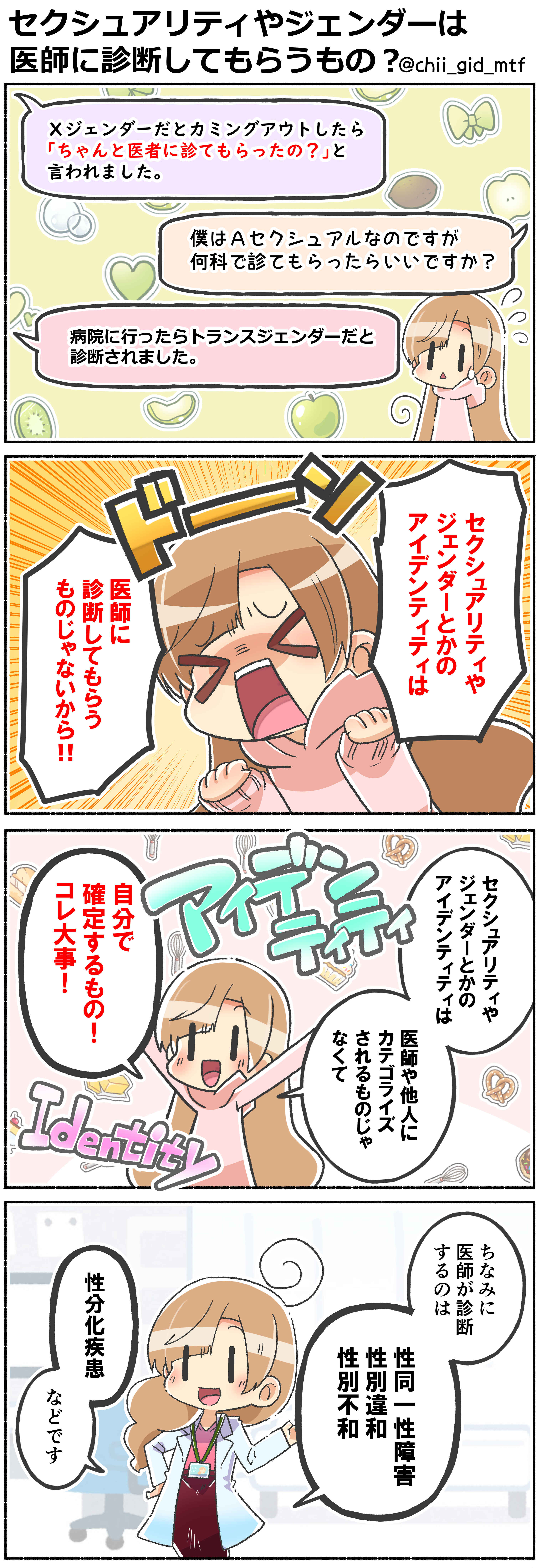 質問を募集しているとたびたびこういった質問やご意見をいただくのですが、マジレスすると【セクシュアリティやジェンダーのアイデンティティは医師に診断してもらうものではないから!】ということです。意外に思うかもしれませんが、ゲイやレズビアンなどのセクシュアリティやトランスジェンダーやXジェンダーなどのジェンダーのアイデンティティは医師の診断などに限らず、他者からカテゴライズされるものではなく、自分の意志で決めるものなのです。つまり自分に決定権がある感じ。