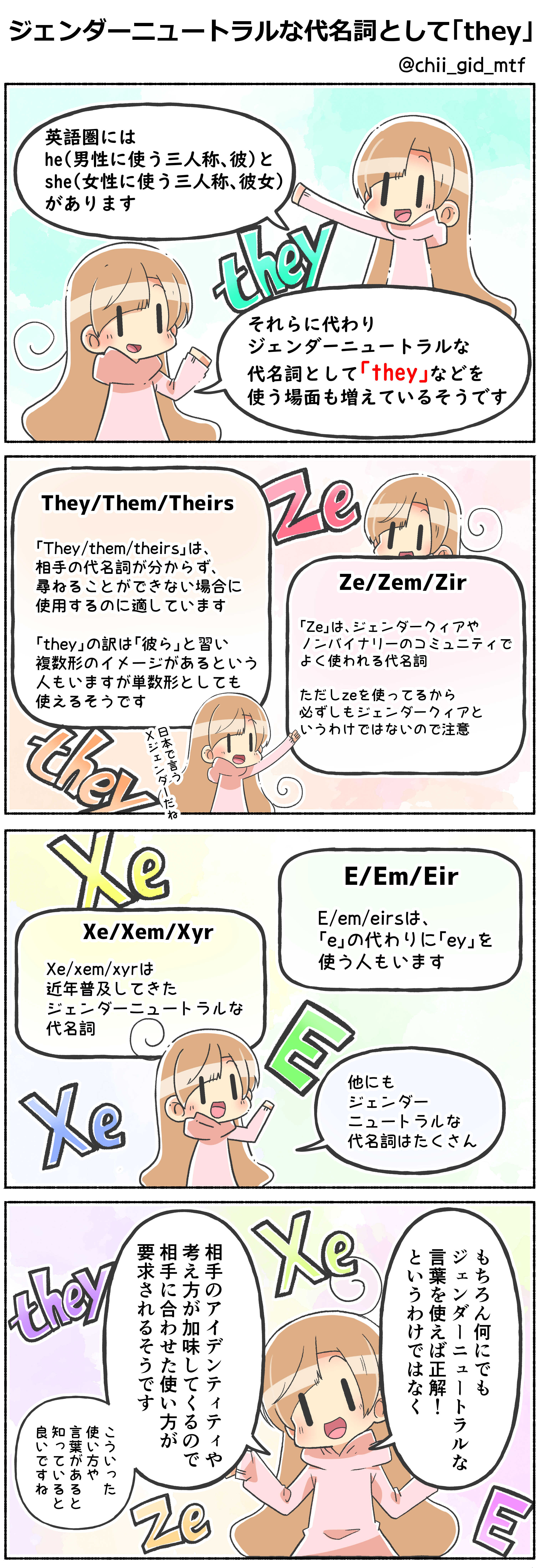 他にも「E/em/eirs」「Xe/xem/xyr」などなどジェンダーニュートラルな三人称はたくさんあるようです。ただ、これらは相手に使う言葉なので、何にでもジェンダーニュートラルな三人称を使えば正解というわけではないらしく、相手の意思を尊重して使わないといけないのだそうです。