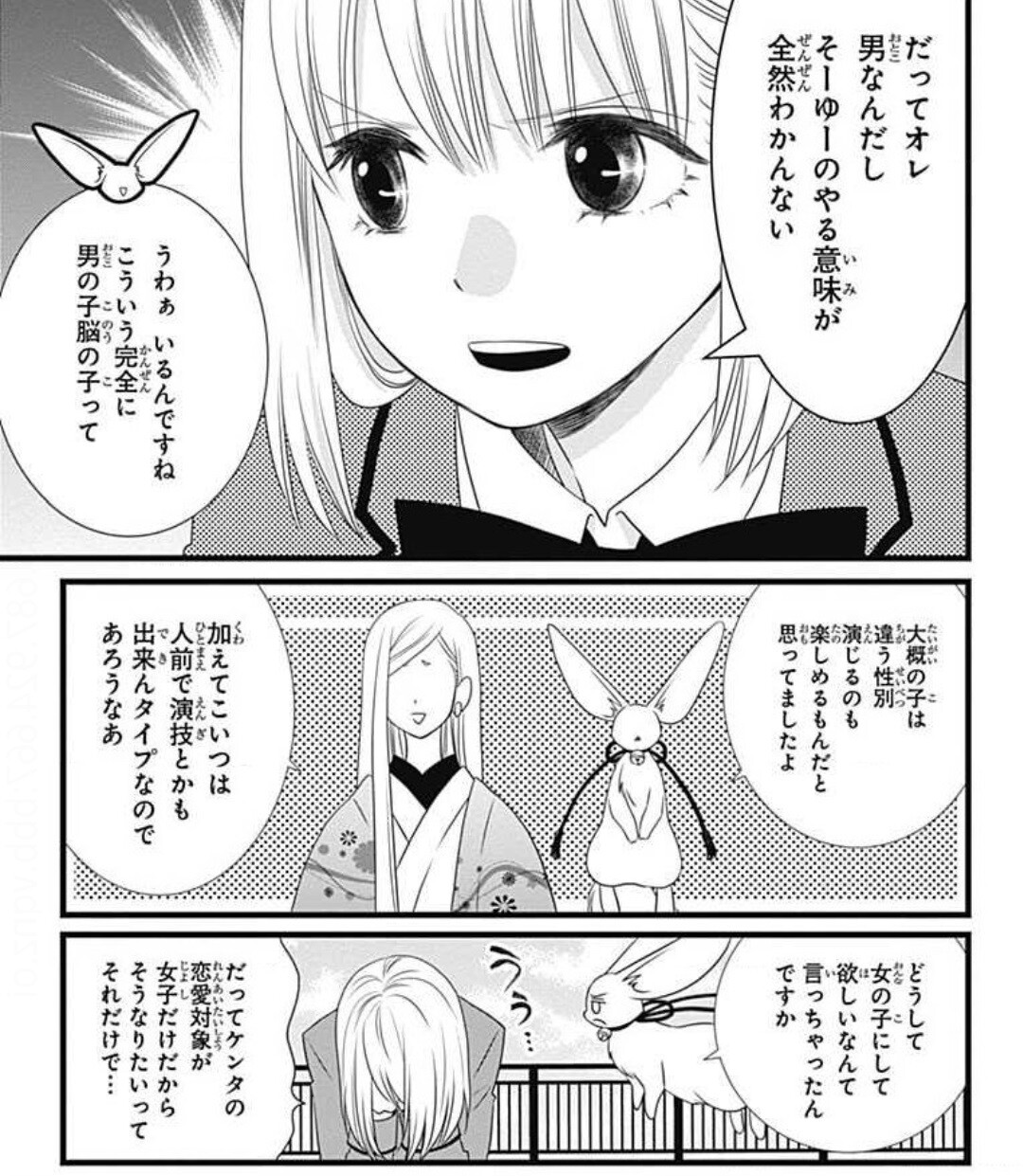 こういったTSファンタジー作品だと男性から女性に性転換したキャラクターは最初こそ性別の違いに戸惑うものの徐々に馴染んでいくことが多いですが、この作品では女らしくすることは早々に諦め、一人称は「オレ」、服装も制服以外はボーイッシュ、最終的に髪も切ってしまうという、女性に性転換した恩恵はどこへやらと、極力生前の生活スタイルを貫くのも特徴です。というも、最初こそは女性らしくしようとした弥白ですが、性自認が男だったためかなかなか馴染めず、さらには例えケンタと付き合えたとしても、それは自分(弥白)ではなく、女である神楽なのだと思ったたまらなく虚しく感じたからでした。