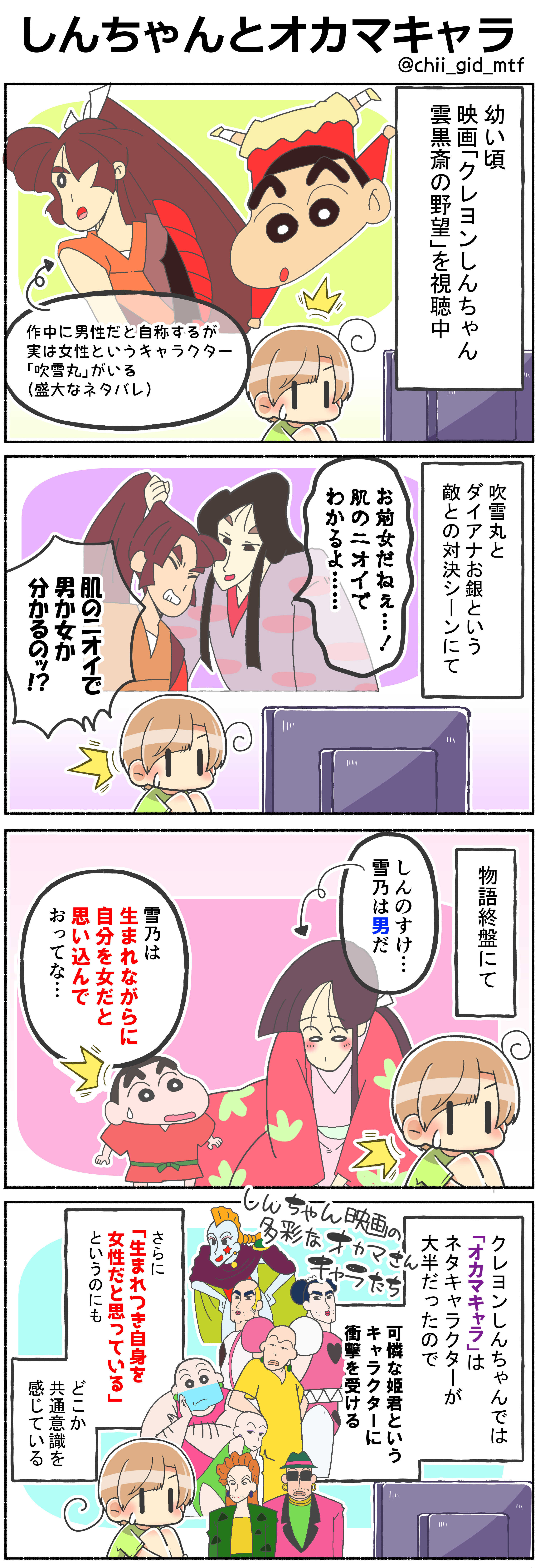 以前ブログのコメントで昔見たある映画を思い出しました。それは『映画クレヨンしんちゃん 雲黒斎の野望』というアニメ映画で、内容としてはしんちゃんファミリーが戦国時代にタイムスリップして……というもの。実はクレヨンしんちゃんには「オカマキャラ」という枠が原作でもアニメでもあり、その豊かで多彩なキャラクターは作品を盛り上げてくれます。