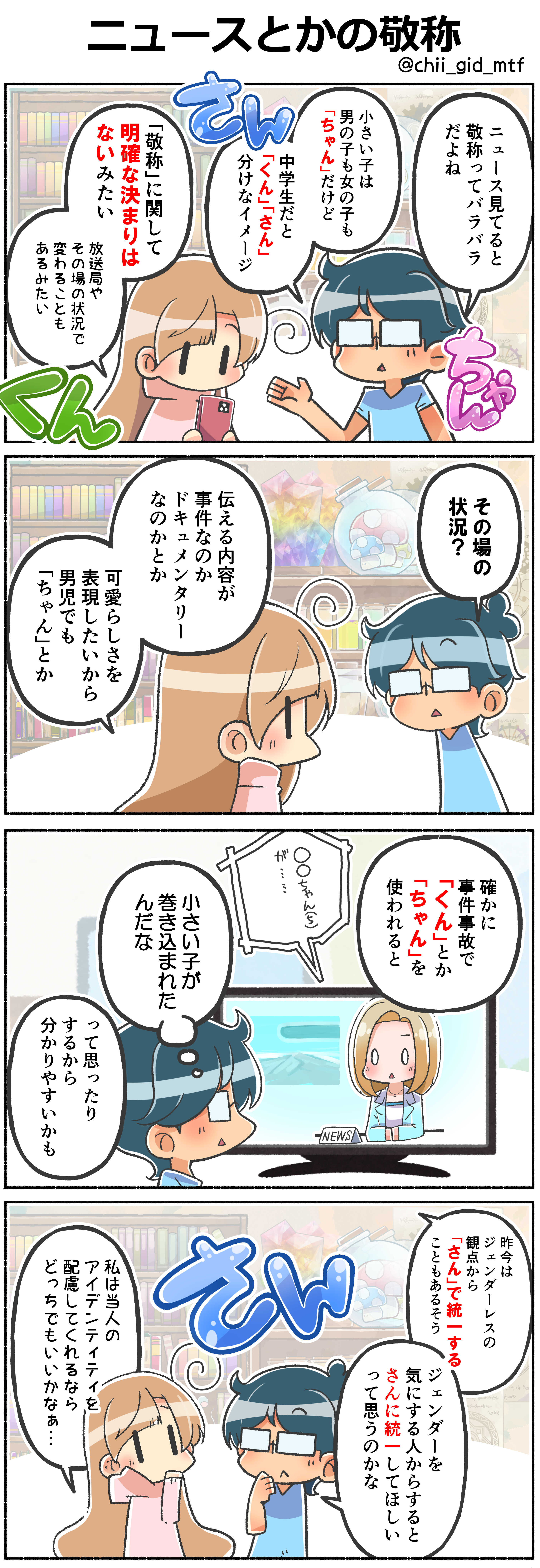 「ちゃん」とか「くん」とか「さん」とか敬称って漠然と「くん」は男の子っぽさ、「ちゃん」は女の子っぽさみたいなのは感じますが、実際はそれほど性別性はないんですよね。