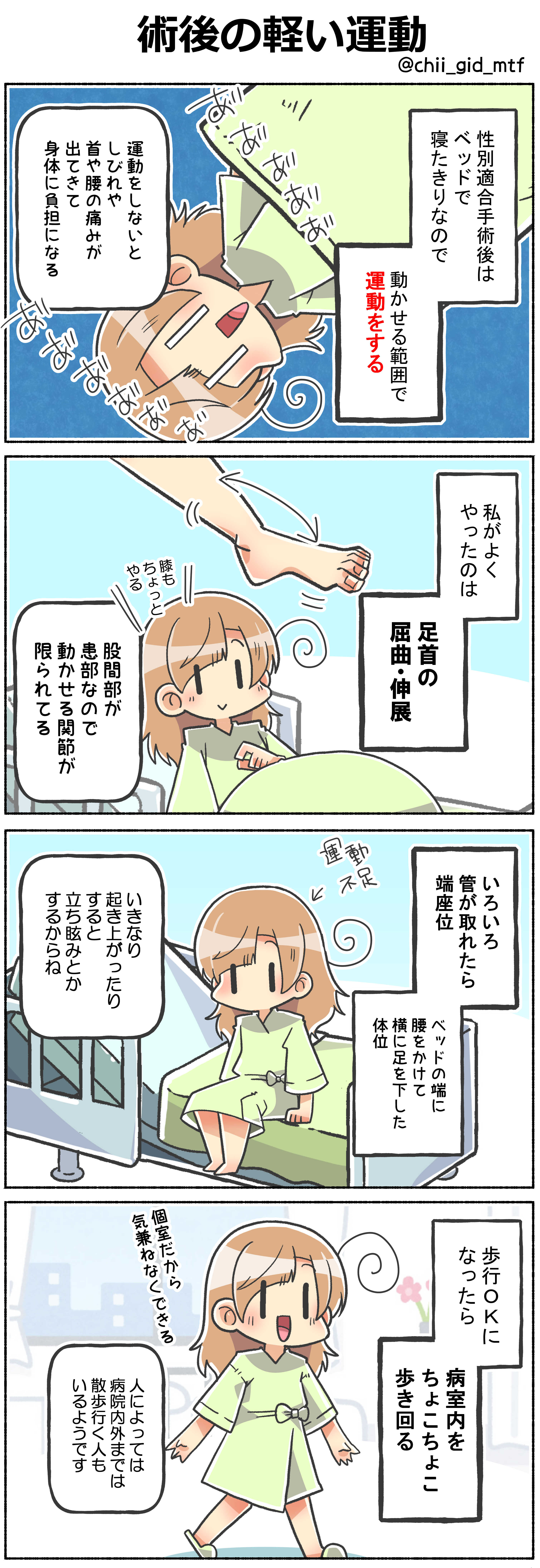性別適合手術後はベッドで寝たきりなので、動かせる範囲で運動をします。運動をしないとしびれや首や腰の痛みが出てきて身体に負担になるそうです。