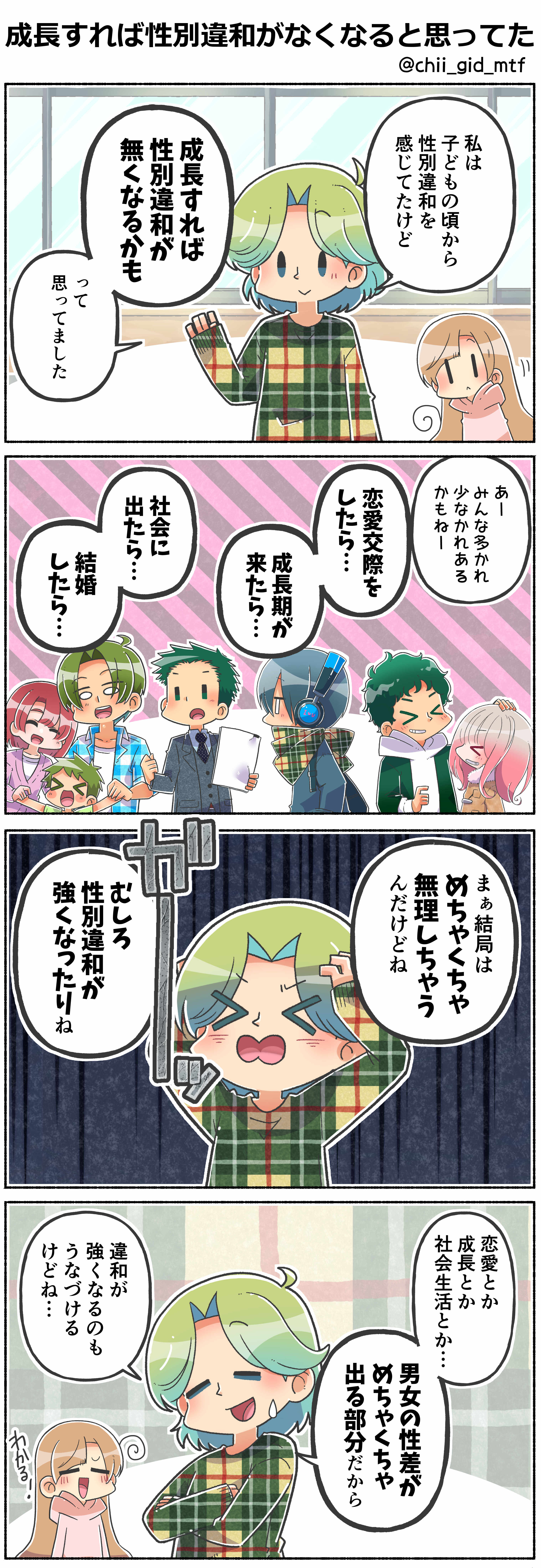 私は子どもの頃から性別違和を感じてたけど、成長すれば無くなるかもって思ってました。恋愛交際をしたら…成長期が来たら…社会に出たら…結婚したら…まぁ結局はめちゃくちゃ無理しちゃって、むしろ性別違和が強くなったり
