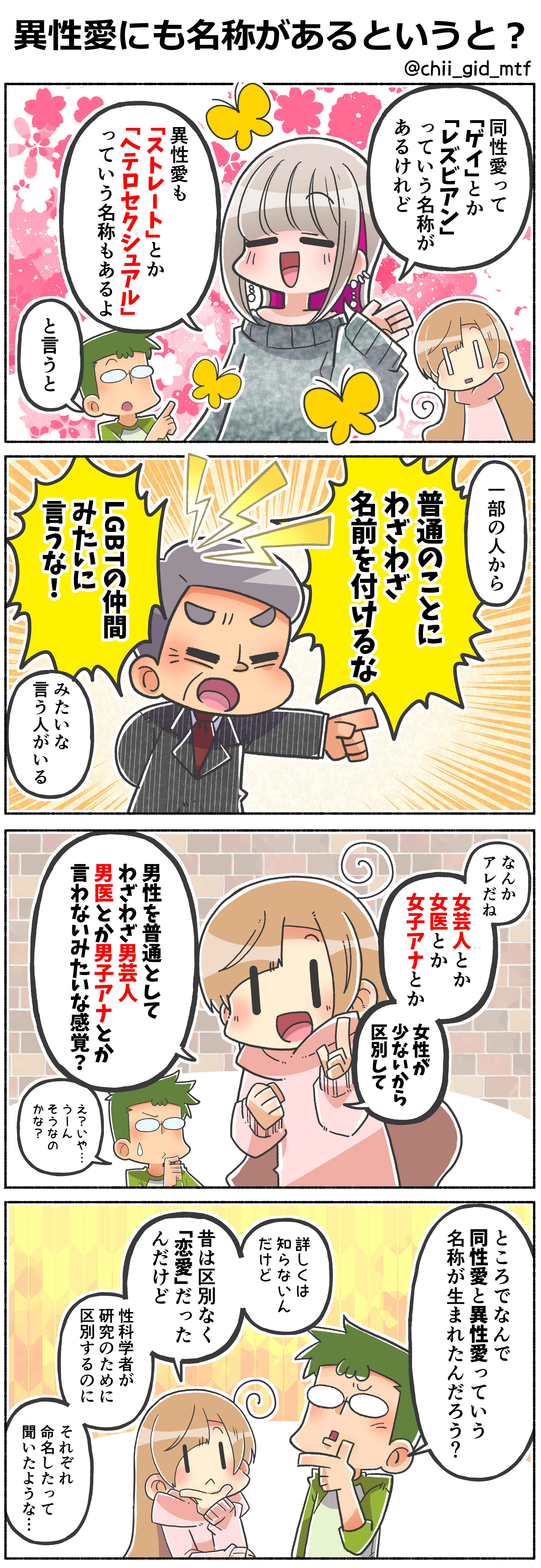 同性愛って「ゲイ」とか「レズビアン」っていう名称があるけれど、異性愛も「ストレート」とか「ヘテロセクシュアル」っていう名称もあるよ…っていうことを言うと、一部の人から「普通のことにわざわざ名前を付けるな」「LGBTの仲間みたいに言うな!」みたいなことを言う人がいるらしい。