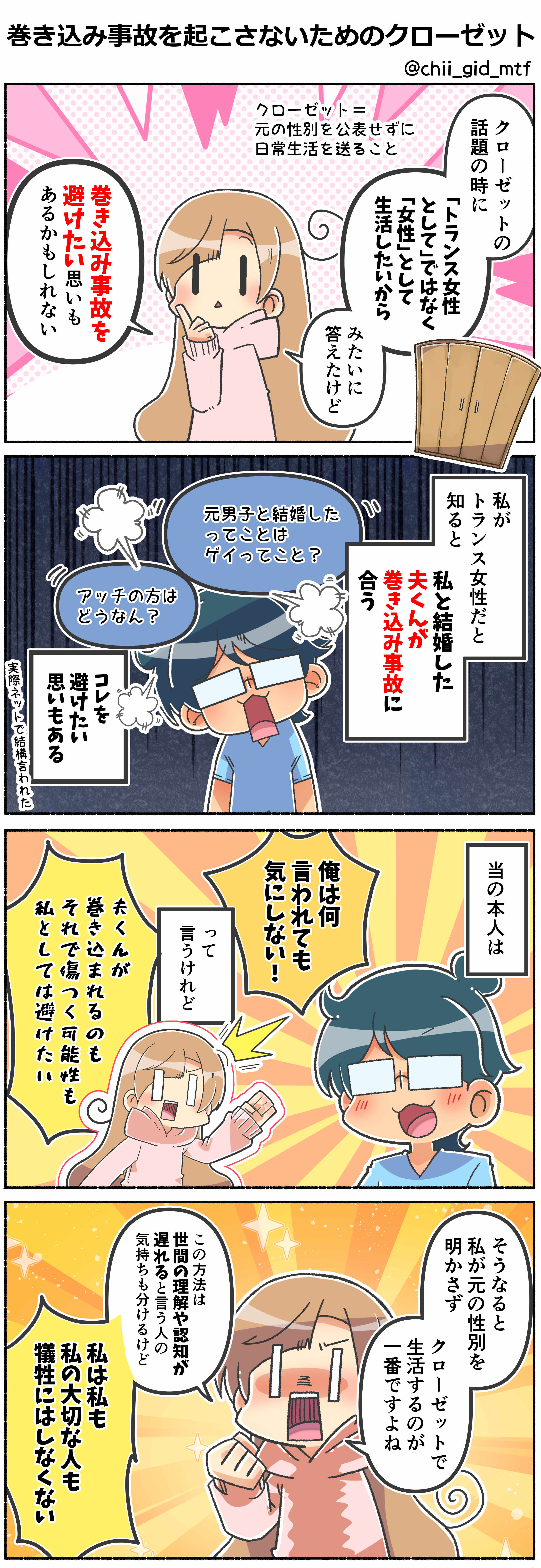 以前、クローゼットの話題の時に『「トランス女性として」ではなく「女性」として生活したいから』みたいに答えたけど、巻き込み事故を避けたい思いもあるかもしれない。