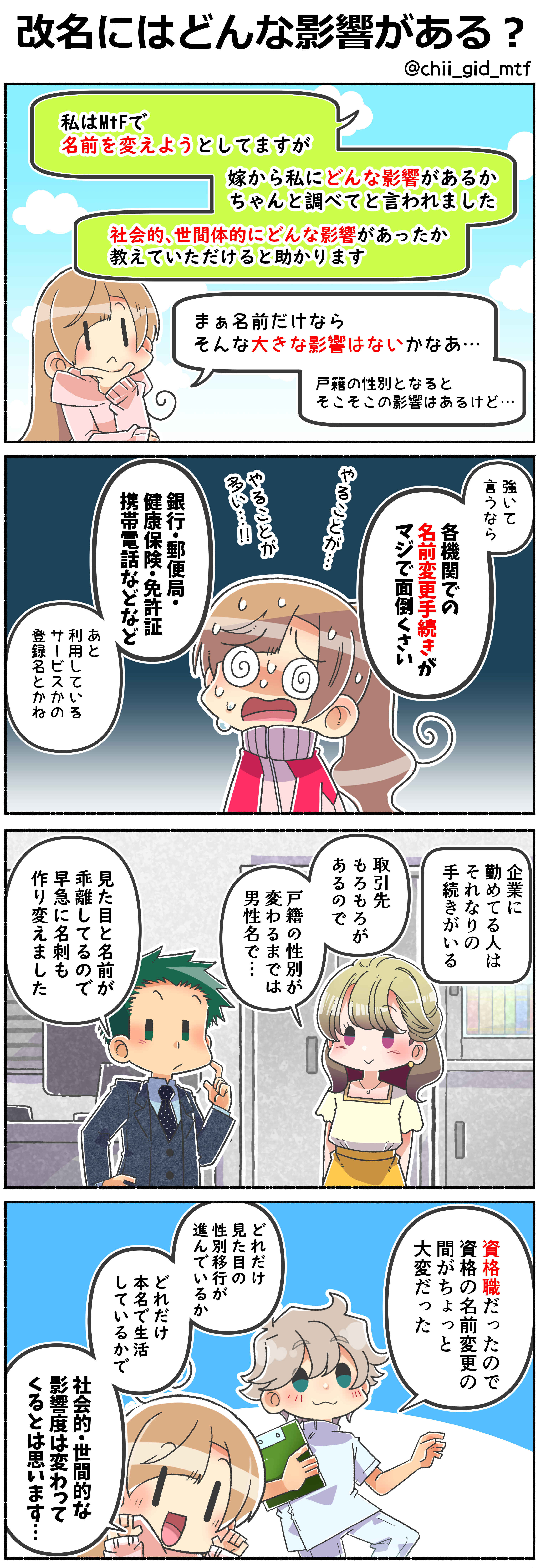 結局のところ、どれだけ見た目の性別移行が進んでいるか、どれだけ本名で生活しているかで、改名による社会的・世間的な影響度は変わってくるとは思います…。